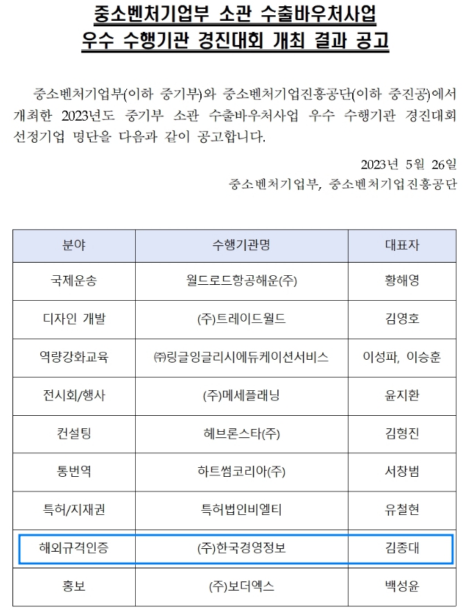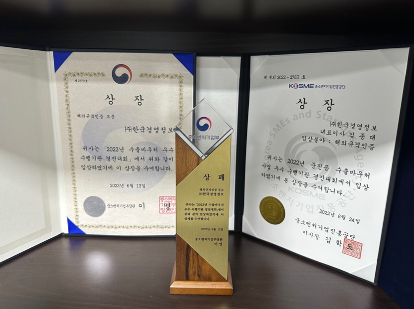 2023년 수출바우처 우수수행기관 선정(해외규격인증분야) 페이지 정보 작성자 : KMIT 조회수 : 728회 작성일 : 23-07-03 본문 당사는 2022년, 2023년 2년 연속 수출바우처사업 우수수행기관으로 선정이 되었고,올해 해외규격인증분야 수출바우처사업 우수수행기관으로는 (주)한국경영정보 한 곳만 선정이 되었습니다. 목록 이전글KTR 전담대응반 충남중기청 오프라인 인증상담회 25.12.03 다음글2022년 수출바우처 우수수행기관 선정(해외규격인증분야) 23.06.29