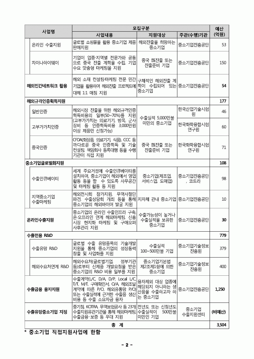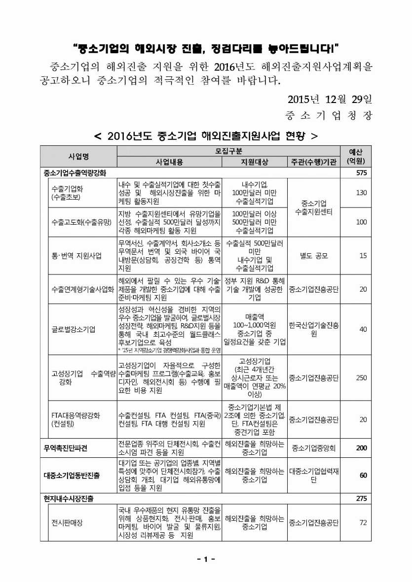 2016년 해외마케팅지원사업 통합공고 페이지 정보 작성자 : KMIT 조회수 : 18,091회 작성일 : 16-01-11 본문 . 목록 첨부파일 151229+2016년도해외마케팅지원사업통합공고(해외시장과)_최종.hwp (3.3M) 109회 다운로드 | DATE : 2016-01-11 09:23:27 이전글2016년도 중소기업 해외규격인증획득지원 사업안내 16.02.19 다음글CE(ATEX)인증 컨설팅 실적(2015년 11월 기준) 15.04.22 댓글 0 댓글목록 등록된 댓글이 없습니다.
