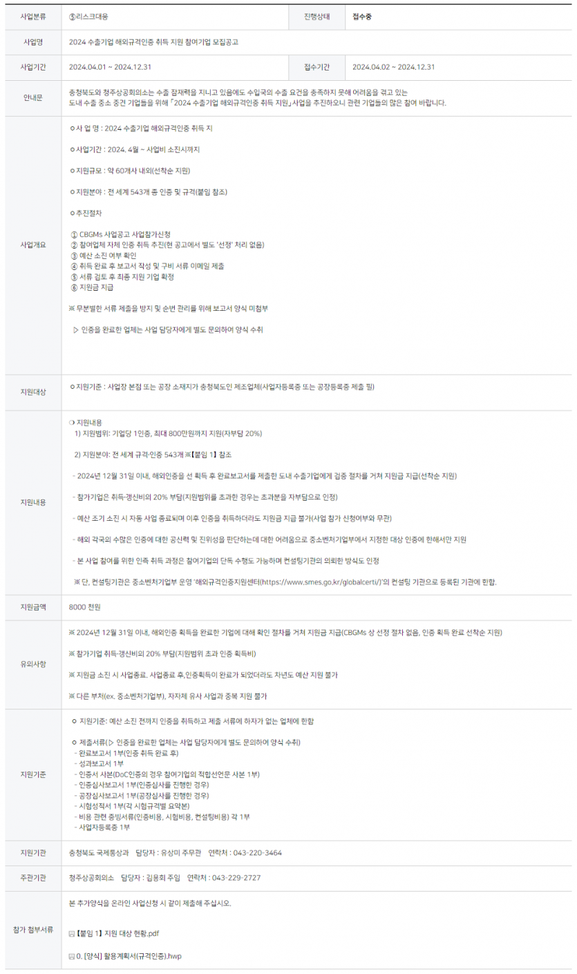 2024년 충북 수출기업 해외규격인증 취득 지원 참여기업 모집 공고
