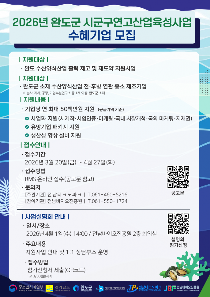 [전남] 완도군 2026년 수산양식산업 활력 제고 및 재도약 지원사업 모집 공고(시군구연고산업육성사업 부처협업프로젝트)